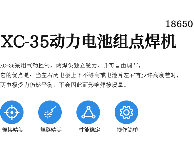 双脉冲点焊机:采用气动控制,两焊头独立受力,并可自由调节。XC-25采用气动控制,两焊头独立受力,并可自由调节。它的优点是:当左右两电极上下不等高或电池片左右有少许高度差时,两电极受力仍然平衡,不会因此而影响焊接质量。
